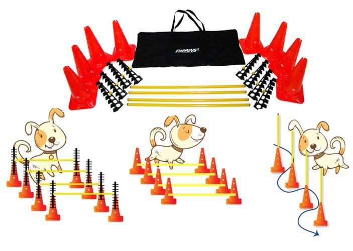 Dit behendigheidsset is van onschatbare waarde voor jouw eigen hond in de achtertuin, voor de reizende dierenrevalidatietherapeut of voor professionele hondentrainers. De set bestaat uit volledig verstelbare en draagbare kegels en hordes voor het trainen van de behendigheid van jouw honden. In de set zitten vier springbalken van 102 cm, acht goed zichtbare oranje kegels, acht opzetstukken om de hoogte aan te passen en een zwarte nylon draagtas. De set is geschikt voor gebruik binnen en buiten. De hoogte van de springbalken is verstelbaar van 5 tot 76 cm in intervallen van 5 cm. De set is perfect voor simpele revalidatie of voor meer uitdagende behendigheidstraining. De accessoires zijn licht van gewicht, zodat je ze gemakkelijk mee kunt nemen.