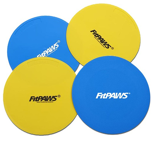 De set bestaat uit twee gele en twee blauwe targets. Met deze doelwitten zijn ongekend veel mogelijkheden. Plaats bijvoorbeeld een doelwit op de grond en gebruik een klikker of snoepjes om uw hond te belonen wanneer hij interesse toont in het doelwit. Je kunt beginnen hem te lokken met een snoepje voor zijn neus en deze vervolgens boven het doelwit te houden. Of overweeg de shaping-methode te gebruiken om je hond eigen beslissingen te laten maken. Beloon je hond wanneer zijn poot op het doelwit staat. Verplaats dan het doelwit en zie of je hond het spel kan volgen. Gebruik FitPAWS targets dan ook om de commando’s ‘blijf’, ‘ga weg’ of ‘ga daarnaartoe’ aan te leren.